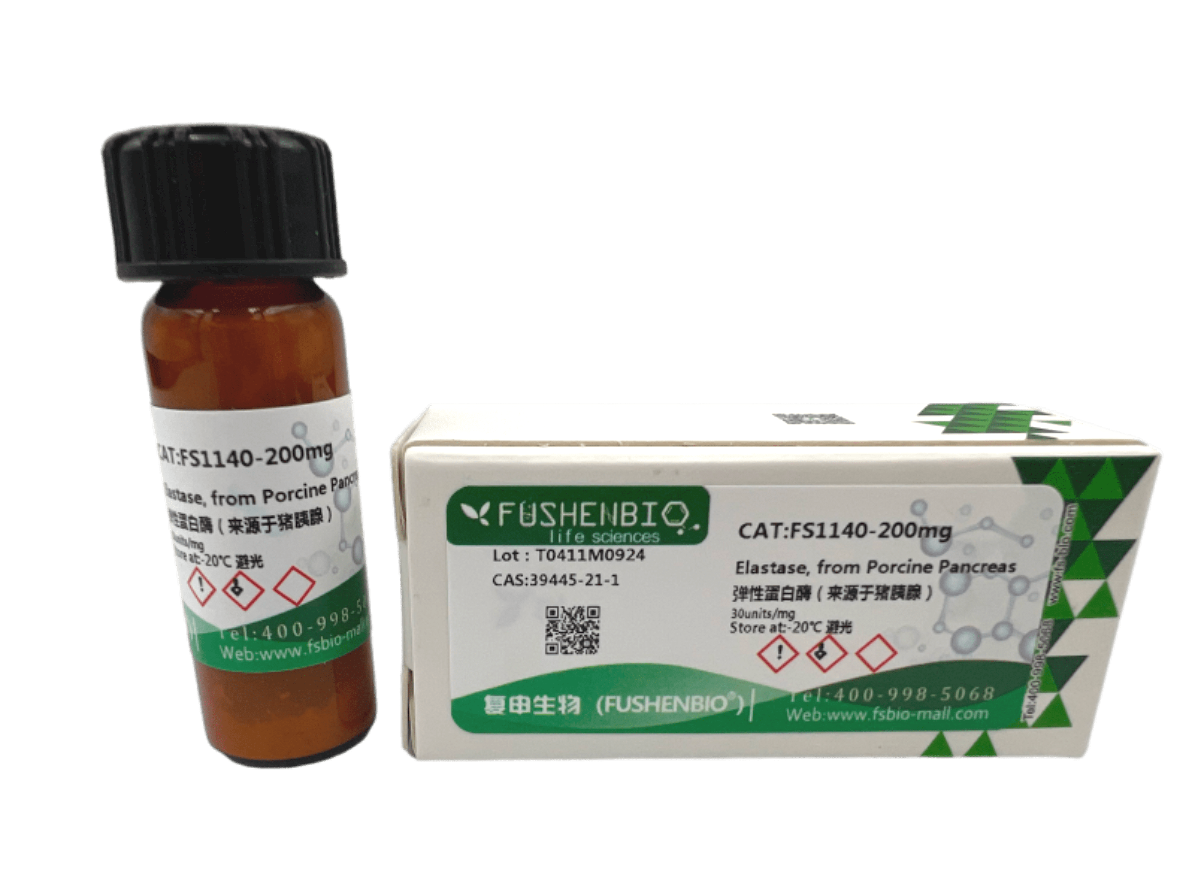 本品是豬胰腺來源的彈性蛋白酶,經親和色譜純化所得,凍干粉形式提供,不含殘留的污染蛋白酶,比活力≥30 U/mg protein。